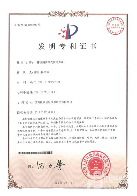 國家知識產權局于2013年12月11日授予銳取《一種檢測圖像變化的方法》發明專利證書。