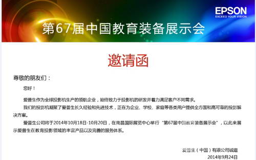2014年10月18日-10月20日,第67屆中國教育裝備展將在南昌隆重舉行。此次展會不僅是我國教育裝備行業(yè)最具權(quán)威的展會之一,也是聯(lián)系教學(xué)設(shè)備研發(fā)、生產(chǎn)、使用的重要橋梁。愛普生作為世界投影機的領(lǐng)航企業(yè),將攜旗下數(shù)款全新投影機、八大業(yè)內(nèi)領(lǐng)先的投影機解決方案亮相展會現(xiàn)場,勢必掀起教育裝備行業(yè)新一輪的技術(shù)改革浪潮。
