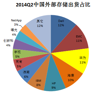 從出貨量角度分析,2014年第二季度前5名中國產廠商除華為以11%排名第三外,海康威視以10%超越HP、IBM位列第四位,一、二、五位被DELL、EMC、HP占據,IBM跌出前5。國產廠商增長強勁。