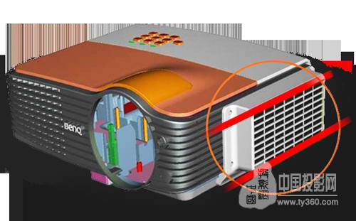 其二,DX806ST針對脆弱的色輪傳感器部分采用物理包裹的方式進行保護。DLP投影機的色輪由于工作時一直在高速旋轉,會將散熱風流中灰塵卷入,并堆積在色輪傳感器周圍。若非常敏感的色輪傳感器被灰塵覆蓋將會導致投影機丟失色彩或者無法開機。BenQ明基針對投影機最易招灰塵侵蝕的色輪傳感器部分專門設計色輪防塵罩,將色輪迎風面積盡可能包裹起來,阻斷可能給傳感器帶來灰塵堆積的風路循環,大幅度提升投影機在高粉塵環境下生存能力。相較競爭對手比如改變色輪傳感器安裝角度或者改變色輪傳感器面積等治標不治本的方法,采用物理包裹是最終極的防塵解決方案,但這需要在色輪散熱和防塵方面取得平衡,這方面無疑是明基多年在投影機熱學方面技術積累的生動體現。