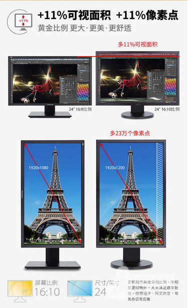 同時,其24英寸、1920*1200的全高清分辨率能展現更加清晰的高品質畫質,也極為適合娛樂使用,讓用戶在觀看電影和瀏覽圖片時體驗更多細節,真正做到娛樂辦公兩不誤。此外,該款產品還十分關注用戶的視角體驗,可提供接近極限的178°超廣視角,讓用戶在極限角度同樣可以欣賞到精彩的畫面,進一步提升了用戶體驗。