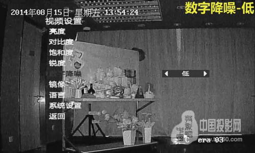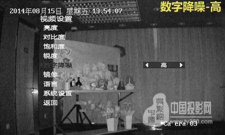 最后進入OSD菜單,將數字降噪設為關閉,此時,發現畫面出現較多雪花;而選等級“中”時,雖然畫質提升了不少,但圖像仍有噪聲;只有當數字降噪在“高”的等級下,才能確保無光時,畫面仍顯干凈整潔。