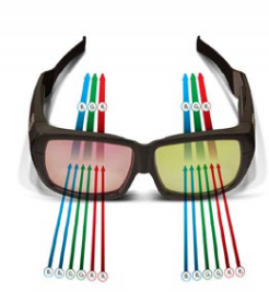 另外一種用于低增益白幕的解決方案采用了現有的分色3D技術。此方法的優點是,銀幕上的圖像是利用紅、綠、藍原色的合成而創造的。專門設計的眼鏡能從穿過每只眼的光中濾出特定波長的光。通過合成RGB原色(R1G1B1)而產生一只眼睛的圖像。利用不同的原色(R2G2B2)來產生另一只眼的圖像,從而保證每只眼只能看見正確的圖像。