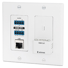 Extron 電子非常高興地宣布 XTP R HWP 201 現已供貨,這款用于 XTP Systems 的 Decora® 型墻面板接收器是 Extron 獨有、專為安裝在空間有限的掛壁式顯示器后面而設計的。它的 HDMI 輸出連接器呈 90° 朝上,這樣即使是安裝在薄型平板顯示器的后面也能方便地接線。這款符合 HDCP 標準的接收器可通過單根 CATx 屏蔽電纜接收來自遠端 100 m(330')處傳來的 XTP 信號并輸出視頻、音頻、控制、以及以太網信號至顯示器。同時它還具有 HDMI 音頻解嵌功能,帶模擬立體聲音頻輸出和音量控制。為了簡化集成,XTP CrossPoint 矩陣切換器可對墻面板接收器進行遠程供電。XTP R HWP 201 設計用于 XTP Systems,以支持墻面安裝環境下的長距離信號傳輸。