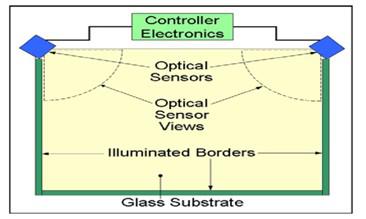 光學觸摸在觸摸屏頂端兩個角處,兩個攝像頭(下圖所示的藍色方塊)分別發出光線,經過四周的反射條反射傳入對方。這樣光線就在觸摸屏上交織成一張光網。接觸到觸摸屏時就會擋住那一點的光線,射出光線和接受光線分別與觸摸屏頂端的水平線形成兩個夾角。觸摸屏長度是既定的,通過簡單的幾何知識就可以計算出觸摸點的坐標并做出反應。