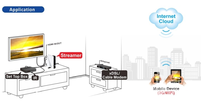 ZIP-930的安裝也很簡單,用網線連接ZIP-930和無線路由器,HDMI IN口連接藍光機(或機頂盒),HDMI OUT口可連接本地電視等顯示設備。手持設備安裝好Vpier333這個APP后,家里的手機、平板電腦利用局域網內的WiFi即可收看藍光機播放的內容,戶外用戶通過WiFi/3G/4G也能收看到家里正在播放的電視節目。