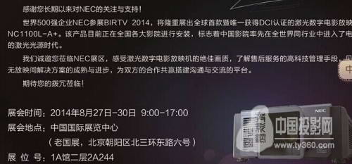 2014年8月27-30日,BIRTV2014將在北京國際展覽中心舉行。全稱為“北京國際廣播電影電視展覽會”的BIRTV,是中國最具權威的廣播影視綜合展覽會之一,到2014年,已經是第23屆。屆時將有全球知名的廣電行業廠商參展。其中具有百年歷史的國際顯示巨擘NEC將隆重展出全球首款唯一獲得DCI認證的激光數字電影放映機NC1100L—A+。該產品目前正在全國各大影院進行安裝,標志著中國影院率先在全世界同行業中進入電影的激光光源時代。