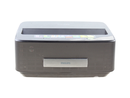 從產品的外型上來說,它就像是一個超大的iPod底座,機身前面板擁有碩大的金屬網狀揚聲器,也沒有傳統投影儀的大型鏡頭,因為鏡頭實際上隱藏在機身頂部,畫面向上投射,所以可以形成短距投射效果,在250px到1100px距離即可投放50到100英寸的大畫面,無論是客廳還是臥室都能夠很好的擺放,而且非常簡潔。產品采用了LED光源,燈泡壽命為3萬小時,擁有700流明的亮度,對比度高達100000:1,能夠為用戶呈現更高高清完美的畫質。