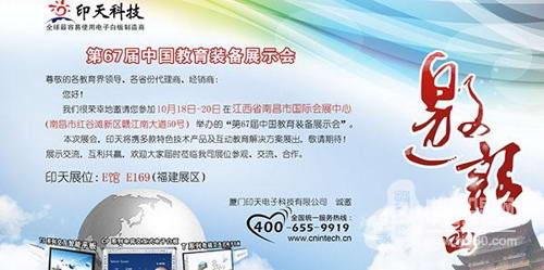 由中國教育裝備行業(yè)協(xié)會主辦,江西省教育廳和南昌市人民政府承辦,以"展示、交流、創(chuàng)新、發(fā)展"為主旨的第67屆中國教育裝備展示會將于2014年10月18日至20日在江西省南昌市舉行。屆時,印天科技將攜多款特色產(chǎn)品亮相,并提供全方位的互動教育解決方案。
