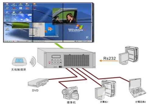 集中式拼接控制系統(tǒng)的應(yīng)用模式如上圖所示:所有信號源全部接入工業(yè)計算機采集,所有輸出也全部經(jīng)由工業(yè)計算機控制,其工作模式即是在工業(yè)計算機顯示輸出卡上模擬一個電腦桌面,然后將所需信號源在該電腦桌面上開啟窗口;