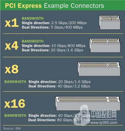 集中式拼接控制系統(tǒng)采用PCI總線串行通訊方式進行視頻數(shù)據(jù)的傳輸與處理,按照目前硬件的最高配置——PCI-E 16x的理論最高帶寬為6.4GBps(參見下圖IBM提供的標(biāo)準(zhǔn)數(shù)據(jù));根據(jù)實際情況測算,除去自身消耗和編碼損耗,其能提供的實際帶寬約為4GBps;
