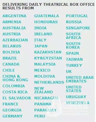 Rentrak也開通了“海外票房”服務,可提供40個國家的25000家影院(110000塊銀幕)的票房情況。