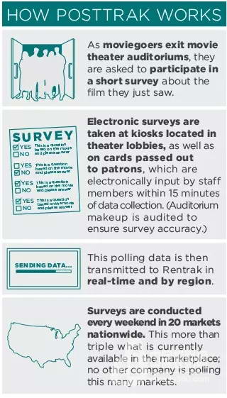 PostTrak則利用人口統計學,在影片上映后,以問卷形式進行觀眾喜好調查,比如觀眾觀看電影的原因、對電影的預期是否實現、是否會向親友進行影片推薦、是否會購買影碟或網絡觀看權。
