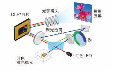 將紅(高亮度紅色LED)、綠(藍色激光通過熒光體轉換為綠色)、藍(藍色激光)三色,通過DLP®芯片投影,通過加入激光,從而打破了以往LED技術瓶頸,跨過了低流明度的鴻溝,做到了不使用高壓水銀燈泡而實現高亮度投影。
