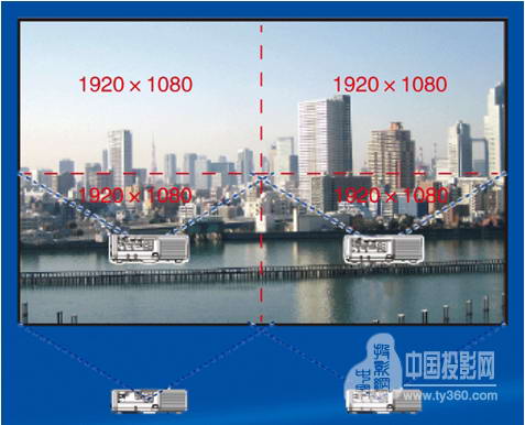 高清信號的點對點顯示。通過把3840×2160通過自拼接功能分割成4個1920×1080給4臺投影機顯示不同部分,可以實現真正的4K超