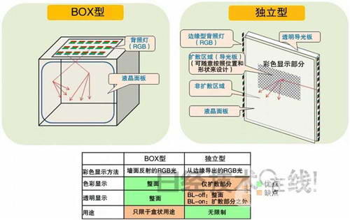 透明液晶顯示器有盒狀“BOX型”和板狀“獨(dú)立型”兩種形態(tài)。前者在盒子前部配置了液晶面板,并在盒頂部分設(shè)置了背照燈光源。特點(diǎn)是整個(gè)面板都能顯示彩色視頻或變成透明狀態(tài)。后者將設(shè)置在液晶面板背面的導(dǎo)光板及其側(cè)面光源作為背照燈來(lái)使用。其特點(diǎn)是,因?yàn)槭前鍫睿惭b場(chǎng)所方面的限制比較小。不過(guò),這種款式只能在液晶面板的局部區(qū)域(背照燈光線的擴(kuò)散部分)顯示彩色視頻,其他部分則為透明狀態(tài)。