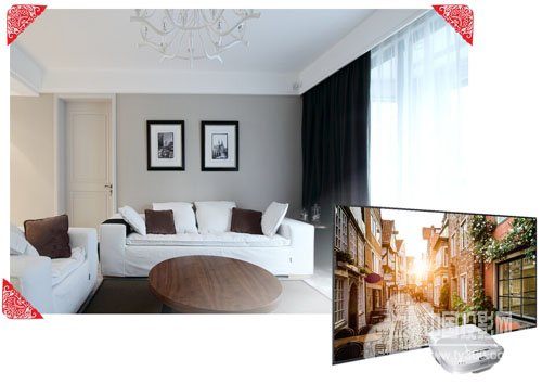 陳的客廳色調素雅,線條簡單。舒適的白色沙發、線條慵懶的黑色躺椅、黑色的窗簾帷幄與白色紗幔……明凈利落,一切都仿佛老電影里“人生若只如初見”的美好場景。而明基智能超投電視i910就放在具有漢代漆器那種光澤與質感的電視柜上,只需要55cm的距離就可打滿100吋超大屏幕。厚度僅3cm的百吋超薄抗光屏幕擁有1.1cm超窄邊框,仿佛懸在墻上的巨幅畫框。不開啟電視時,淺灰色的抗光屏幕,珍珠白、星空灰配色的電視主機與整個空間毫無違和感。