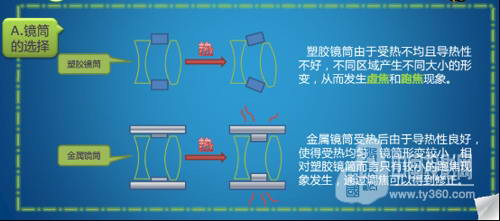 在這里同樣涉及到兩種鏡筒材質(zhì)的特性,塑膠鏡筒由于受熱不均且導熱性不好,不同區(qū)域產(chǎn)生會不同大小的形變,從而發(fā)生虛焦和跑焦現(xiàn)象。金屬鏡筒受熱后由于導熱性良好,使得受熱均勻,鏡筒形變較小,相對塑膠鏡而言只有較小的跑焦現(xiàn)象發(fā)生,通過調(diào)焦可以得到修正。