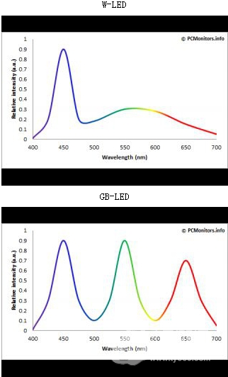 不管是投影儀還是電視機都采用的是RGB-LED光源,也就是紅黃藍三色LED光源,而這3種顏色的LED,以“藍光LED”最為重要,減弱藍光則會使色彩失真,整體畫面色調偏紅黃。一起看看LED顯示器兩種主要發光模塊W-LED(常用)和GB-LED的光譜組成。如下圖: