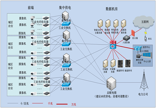 根據(jù)物理環(huán)境,此次建設(shè)中分為N個智能供電箱,采用48V直流供電系統(tǒng),總配電箱通過直流48V電纜線沿著河道石欄的邊沿或城區(qū)排水管道敷設(shè),連接到城區(qū)各個區(qū)域中的集中供電箱,集中供電箱分為正面和背面,背面可以提供48V電源,正面可以架設(shè)工業(yè)交換機。集中供電箱不僅作為傳輸節(jié)點,而且還是智能供電箱體,為前端攝像機和工業(yè)交換機提供24V/48V電源。