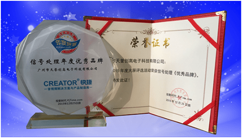 傳遞行業正能量,聚合中國大屏視聽產業核心力量,2015年投影時代網大屏視聽行業年度評選最終授予廣州市天譽創高電子科技有限公司(品牌:CREATOR快捷)2015年度信號處理“優秀品牌”殊榮。