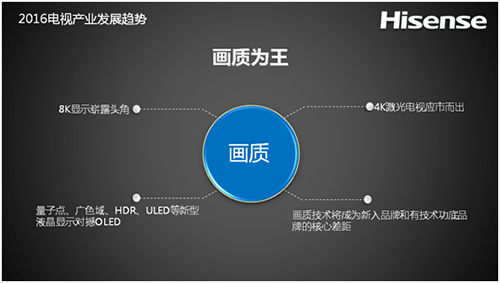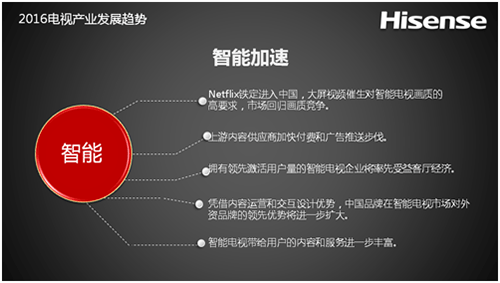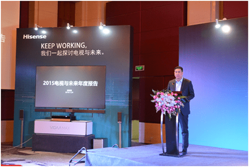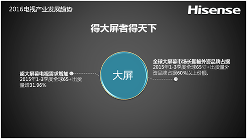 1月24日,海信在京發布2015電視與未來產業發展報告,海信認為,2016年彩電市場的熱點依然會聚焦在智能、畫質和大屏上,主攻高端大屏市場才能有所作為,技術創新能力弱、轉型速度慢的品牌會有掉隊的危險。