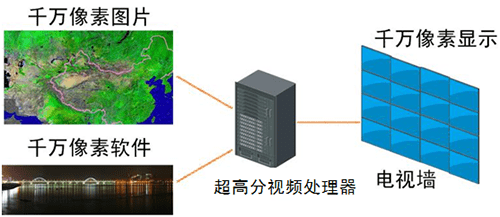超高分顯示實戰平臺依托超高分視頻處理器,采用高速總線傳輸技術和數字圖像處理技術,超高分視頻處理器的圖像數據經過超高分接入模塊進入到系統內部,通過對圖像數據進行分塊處理,然后通過高速背板總線發送給輸出模塊進行輸出顯示,整個實現過程中使用圖像同步技術、解碼技術、遠程控制技術、高速總線傳輸技術。整個電視墻上即可顯示超出千萬像素的地圖或軟件,圖2為千萬像素內容與電視墻之間的關系示意圖。