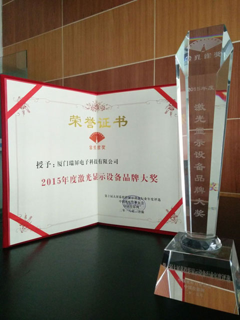 瑞屏電子作為領先推出高清智能DLP激光無拼接大屏幕的專業廠家,積極參加此活動,并憑借不斷的技術創新、優質的產品質量、品牌知名度、客戶美譽度等各方面的突出表現,獲得大家的認可和支持,最終以較高票數獲得“2015年度激光顯示設備品牌大獎”的殊榮。