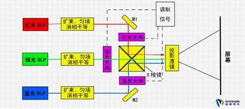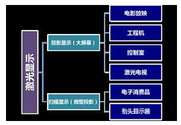 激光顯示有兩個主要的研發(fā)方向。第一個方向是將激光作為新型光源進(jìn)行投影向大屏幕方向發(fā)展,一般采用LCD、LCOS,或者是DMD芯片作為光調(diào)制器,配合鏡頭在屏幕上進(jìn)行投影顯示。投影式顯示器體積、功耗比掃描式大,不同的投影距離需要調(diào)焦才能清晰成像,但投影式激光已經(jīng)攻克了原理研究階段,正在開展大規(guī)模生產(chǎn)階段的攻關(guān)。