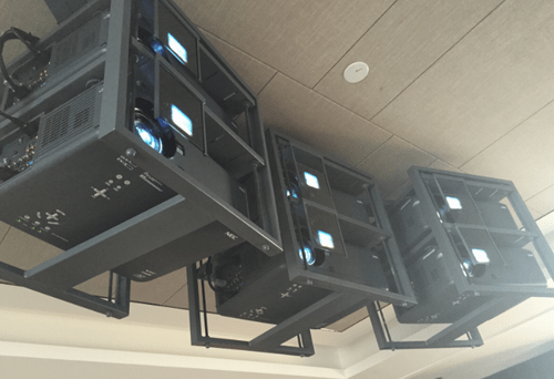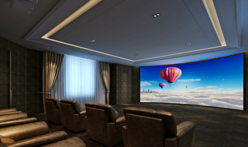 天安金馬中心影音室由于承載著VIP接待、高端會議、視頻賞析等功能,對于顯示終端設備的要求很高,在進行了多種方案的對比之后,最終決定采用弧形幕投影方式。NEC PX581W+投影機有著6000流明高亮度、720P高清分辨率,進行弧形融合后可以全角度、全方位的為來賓展示企業文化、產品、服務等視頻資料,大大提升客戶觀看體驗。考慮到影音室面積、燈光等實際因素,該項目沒有簡單的采用3臺融合的方式,而是6臺投影機先進行兩兩疊加,再進行弧形融合,保證了畫面超過10000流明的充沛顯示亮度,用兼顧性價比和效果的方式充分滿足了客戶的需求,為客戶打造超高清晰度畫面投影效果。