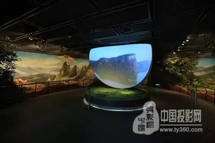 異形球幕區,使用1臺日立TCP-D1080U工程投影機對半球狀造型進行吊頂正投,利用專業軟件進行曲面及異形校正,定制數字內容,呈現郴州地貌風景。