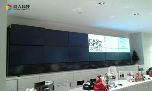 考慮到品牌旗艦店對視頻墻顯示效果及穩定運行等因素的高端需求,能人科技為其選用了口碑頗佳的NEC視頻墻設備。位于店面收銀臺一側的墻面,采用18臺NEC 46英寸超窄邊拼接單元X464UN以3×6的方式拼接成一面巨型視頻墻。輔以后端的信息處理系統,由用戶自定義的圖像、文字或視頻等信息可經由圖像處理器直接上屏顯示。