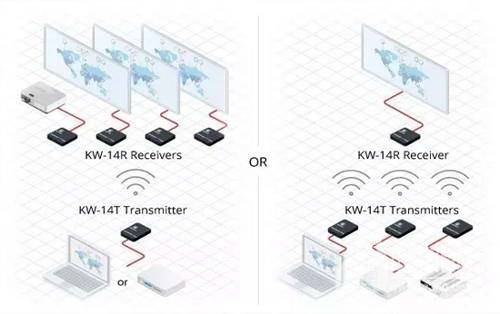 KW-14 是一款短距離無線AV分配HDMI發送器/接收器,用于演示和多媒體環境如會議室、活動空間及教室。