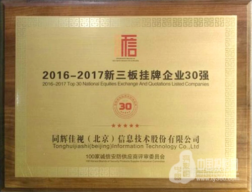 喜訊,同輝信息再獲殊榮!在永泰傳媒第九屆100家誠信品牌安防供應商頒獎盛典上,同輝信息獲得了“100家誠信安防供應商評審委員會”頒發的“2016-2017新三板掛牌企業30強”榮譽獎牌及證書。這標志著同輝信息在安防領域的建樹又一次得到了業界認可。