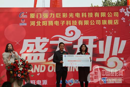 強(qiáng)力巨彩副董事長(zhǎng)周國(guó)華為陽(yáng)騰旗艦店送去十萬(wàn)元開(kāi)業(yè)大禮。