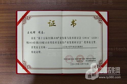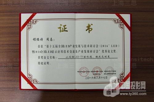 在本屆論壇上,三思總工程師程德詩撰寫的《小間距LED-TV的機遇、挑戰及對策——論小間距LED-TV走入家庭之艱辛路程》以及三思顯示產品委員會主任王化鋒撰寫的《LED顯示屏干擾光問題探討》兩篇論文榮獲“第十五屆全國LED產業發展與技術研討會暨2016全國LED顯示應用技術交流及產業發展研討會”優秀論文獎。