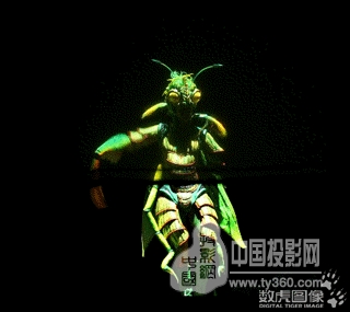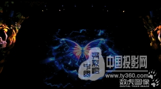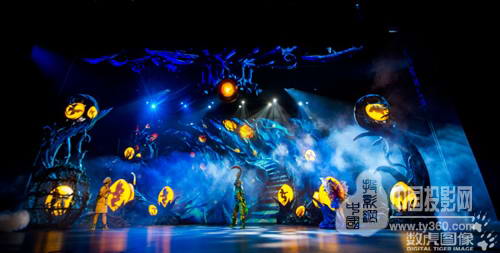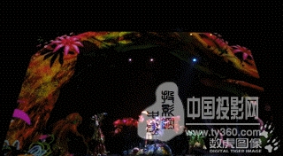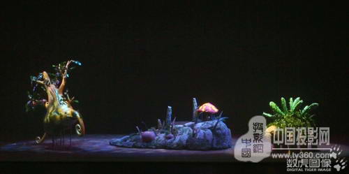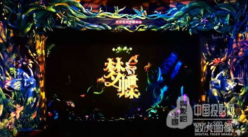 裸眼3D的舞臺(tái)效果則通過精美的舞臺(tái)置景、舞美道具和多媒體影像結(jié)合呈現(xiàn)。為呈現(xiàn)真實(shí)奇幻的原始森林場(chǎng)景,設(shè)計(jì)團(tuán)隊(duì)充分發(fā)揮想象,將食人花、鬼面蝶、毛毛蟲、大龍魚、螳螂等眾多森林動(dòng)植物都搬上舞臺(tái),營(yíng)造盡可能真實(shí)的森林場(chǎng)景。同時(shí)采用正投紗幕、背投膜和異形投影膜結(jié)合,呈現(xiàn)極具縱深感的裸眼3D立體視覺效果。