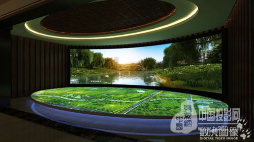 潘安湖文化展館中,數字沙盤由弧幕和地幕兩部分組成。