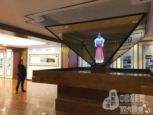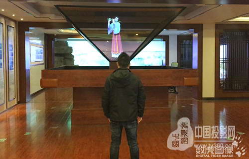 展廳中,一個全息“美男子”成為一大亮點,因為這位“美男子”即是被贊為中國古代十大美男子之首的潘安。潘安湖因晉朝美男潘安暢游徐州山水時留連此處而得名,因此為重現這位歷史人物,數虎圖像通過搭建的倒金字塔式幻影成像全息膜,實現潘安形象的立體重現。當游客走到指定地點向潘安揮手打招呼,全息影像會隨機呈現潘安下棋、練書法等畫面。無人狀態時,呈現潘安站立畫面。