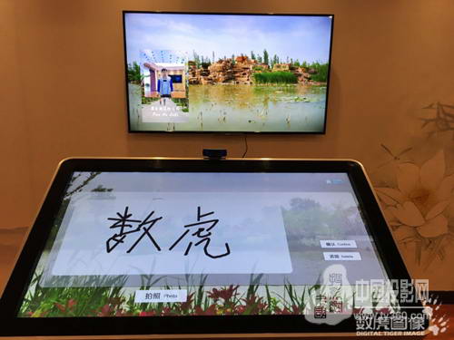 序廳中,互動簽名拍照展項由立式觸摸桌配合墻面顯示屏及圖像捕捉設備組成,游客可以在參觀開始或參觀結束后在此點擊簽名按鍵簽上自己的名字,同時攝影頭會自動識別臉部最佳效果拍照,點擊提交簽名照就會在墻面顯示屏顯示,留下自己的潘安湖濕地的文化游覽足跡。