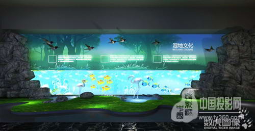 在“濕地文化”展項中,通過模擬現實濕地景觀與虛擬影像畫面的結合,全方位展示濕地文化環境,營造亦幻亦真的視覺效果。
