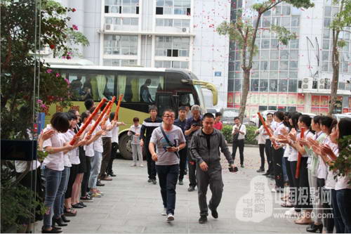 風和日麗的早上,強力巨彩門口禮花與掌聲交織,總部工作人員熱情歡迎千店服務商們回家。