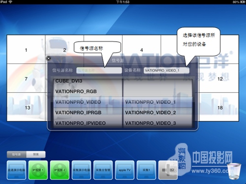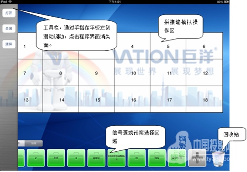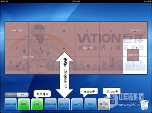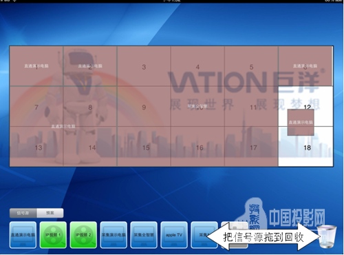 VATION巨洋SMART TOUCH移動控制系統與其他移動控制系統最大的區別在于對信號源的操作,當前大屏幕市場采用的移動控制終端皆是對預案的簡單調用,即前期在控制電腦上設置好整屏的顯示模式、信號開窗方式保存成預案,然后通過移動終端直接調用,這種調用只能是固定的顯示方式,而VATION巨洋SMART TOUCH控制系統是完全獨立于控制電腦的,可以完全取代控制電腦實現對信號源的操作,實現預案設置及任意信號源的調用、疊加、漫游等各種操作。
