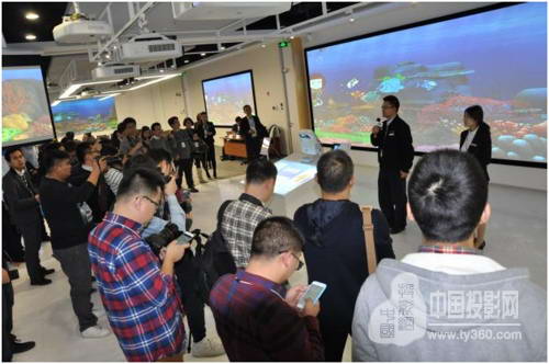 在發布會現場,最搶鏡的還是“多通道拼接融合方案”呈現出的大屏海底世界互動涂鴉,由三臺吊裝的愛普生CB-Z11000U工程投影機拼接融合同步畫面到八米大屏上,清晰的畫質、鮮艷的色彩和魚兒的游動,仿佛真的有一個大水族箱被放置在此,讓參觀媒體眼前一亮。