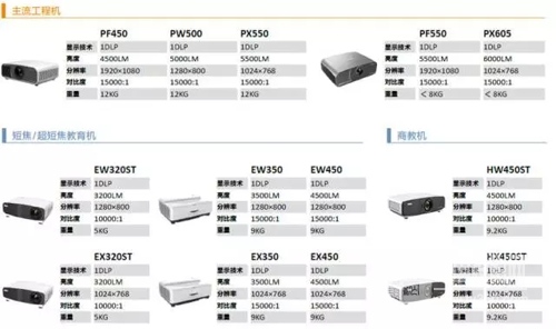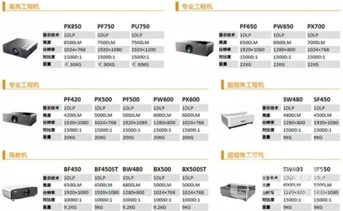 最新產品線包括高亮、專業、主流、超短焦工程機、商教機等類別,形成了對工程、教育、商務市場的全面覆蓋。