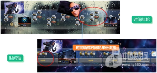 我們設計年輪方式主題區域在屏幕中央,便于用戶操作,一共2套同步年輪進行瀏覽,具有以下功能: