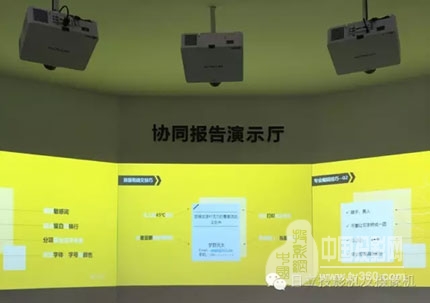 三臺7000流明日立HCP-D877U配合VIS顯示墻互動顯示系統,模擬學校教學應用場景,將PPT以圖片形式導入系統文件夾,用戶通過觸摸進行翻頁操作,并對PPT進行標注甩出,可同時多人進行演示。