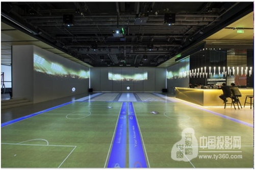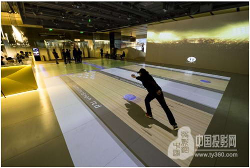 10臺(tái)松下激光工程投影機(jī)PT-FRZ570C打造互動(dòng)地面展示。通過動(dòng)作捕捉感應(yīng)系統(tǒng)識(shí)別有效區(qū)域內(nèi)的人體動(dòng)作,可以控制顯示畫面完成各種動(dòng)態(tài)效果。給人以夢(mèng)幻之感,人走過腳下就有流星劃過。不僅如此,用戶還可以體驗(yàn)打保齡球,踢足球等娛樂活動(dòng)。此互動(dòng)展示設(shè)備的特點(diǎn)是全新介質(zhì)的“互動(dòng)娛樂或信息發(fā)布平臺(tái)”,不占據(jù)地面空間,人流自由通過。