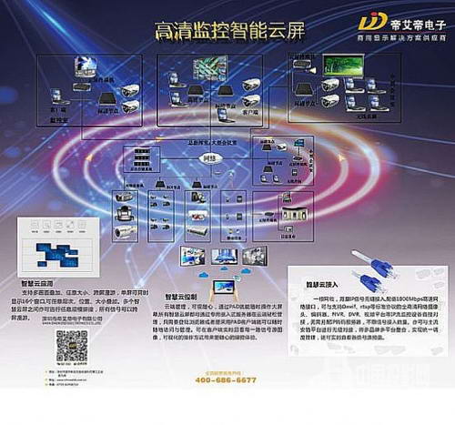 帝艾帝高清監控智能云屏=拼接控制器+編碼器+數字矩陣+多屏顯卡+多類數據線。顯示單元即是信號處理模塊,可接入管理IPC、DVR、NVR以及磁盤陣列等設備,各類模擬攝像頭、網絡攝像頭、各類HDMI/DVI/VGA視頻編碼器輸入。高效集成和優化,引入“互聯網+”以及“云服務”等最新技術推出“高清監控智能云屏”,將取代傳統監視器。將安防產品轉變成安防平臺,安防項目集成轉變成系統升級平臺,以應對現在的安防市場新局面!