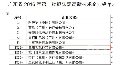 近日,根據(jù)全國高新技術(shù)企業(yè)認定管理工作領(lǐng)導小組辦公室在其網(wǎng)站發(fā)布的《關(guān)于公示廣東省2016年第二批擬認定高新技術(shù)企業(yè)名單的通知》,我司榜上有名。這是紫旭科技繼四款錄播產(chǎn)品通過2016年高新技術(shù)產(chǎn)品認定及科技項目通過科技型中小企業(yè)創(chuàng)新基金項目和惠州市科技項目驗收后的又一殊榮!